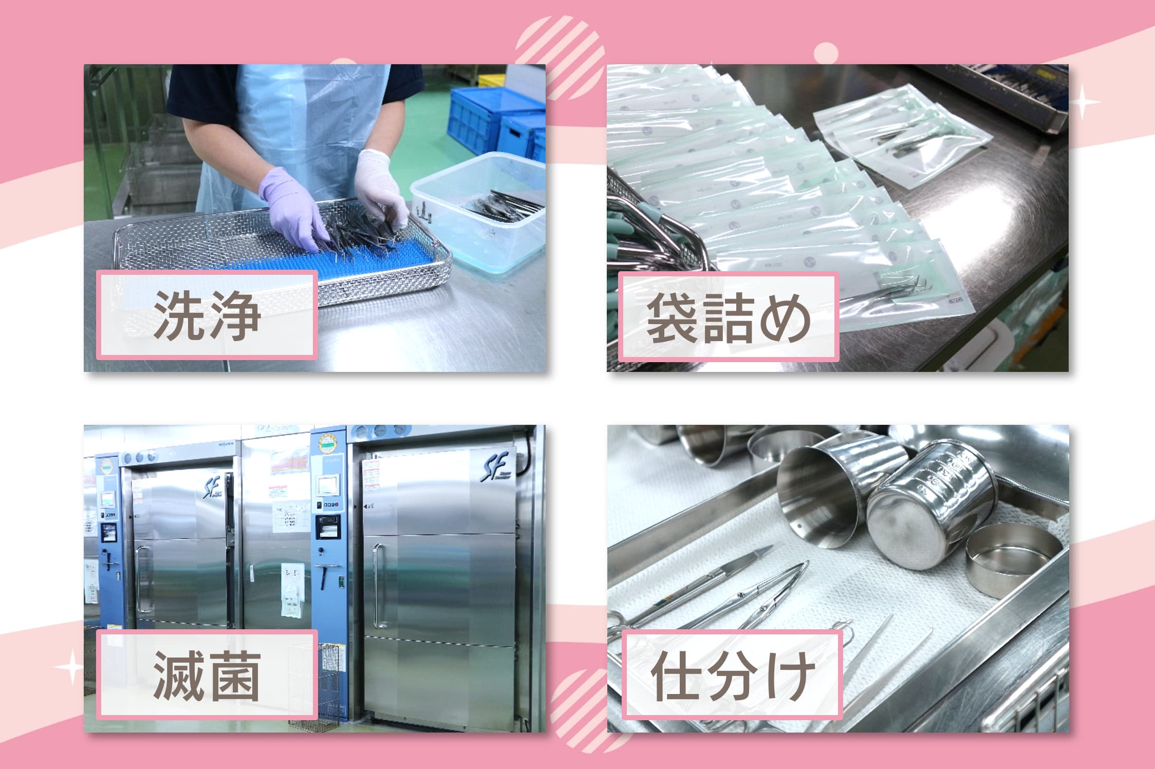 治療や診察で使用するピンセットやハサミ等、使用した医療器具・器材を滅菌するお仕事内容です。