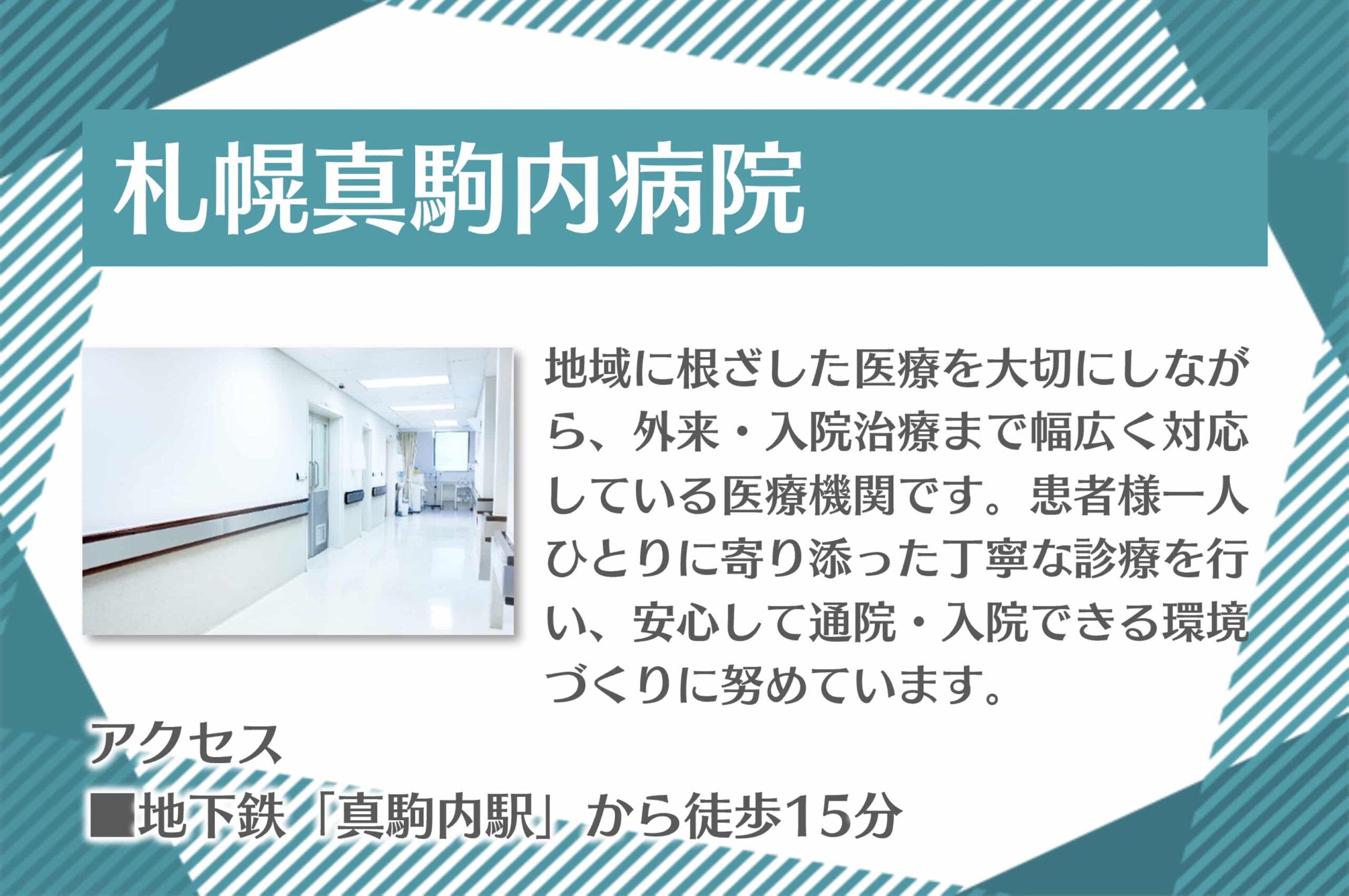 ■札幌真駒内病院 地域に根ざした医療を大切にしながら、外来・入院治療まで幅広く対応している医療機関です。 患者様一人ひとりに寄り添った丁寧な診療を行い、安心して通院・入院できる環境づくりに努めています。 |