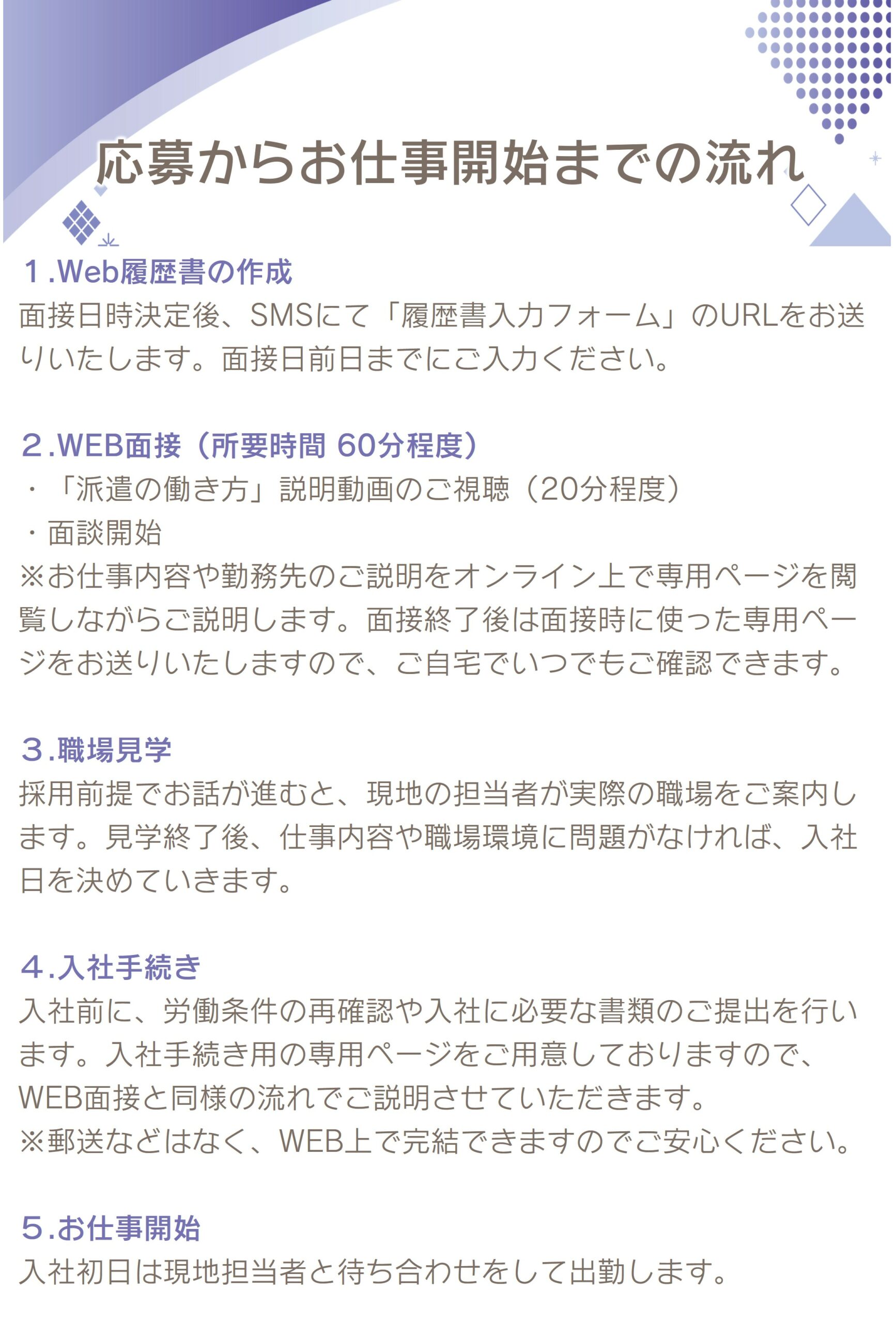 ▼WEB面接 または 来社面接 ▼選考(最短2日~1週間程度) ▼選考結果のご連絡 ▼就業開始 |
