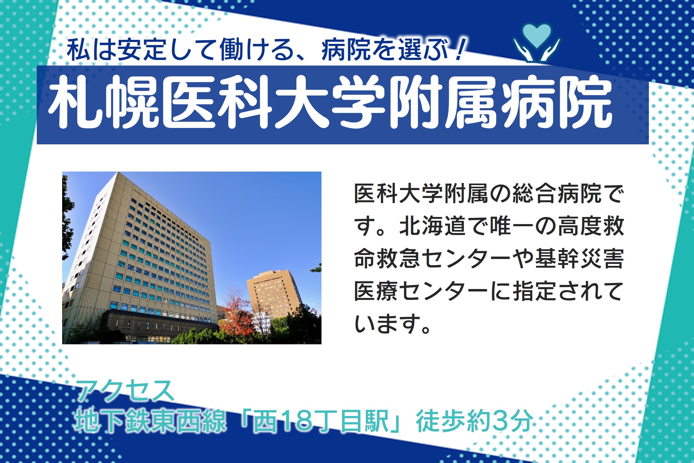 ■札幌医科大学附属病院 北海道の医療と教育の中核を担う高度医療機関です。最先端の医療技術と専門的なチーム医療で、地域医療の発展と人材育成に貢献しています。 |