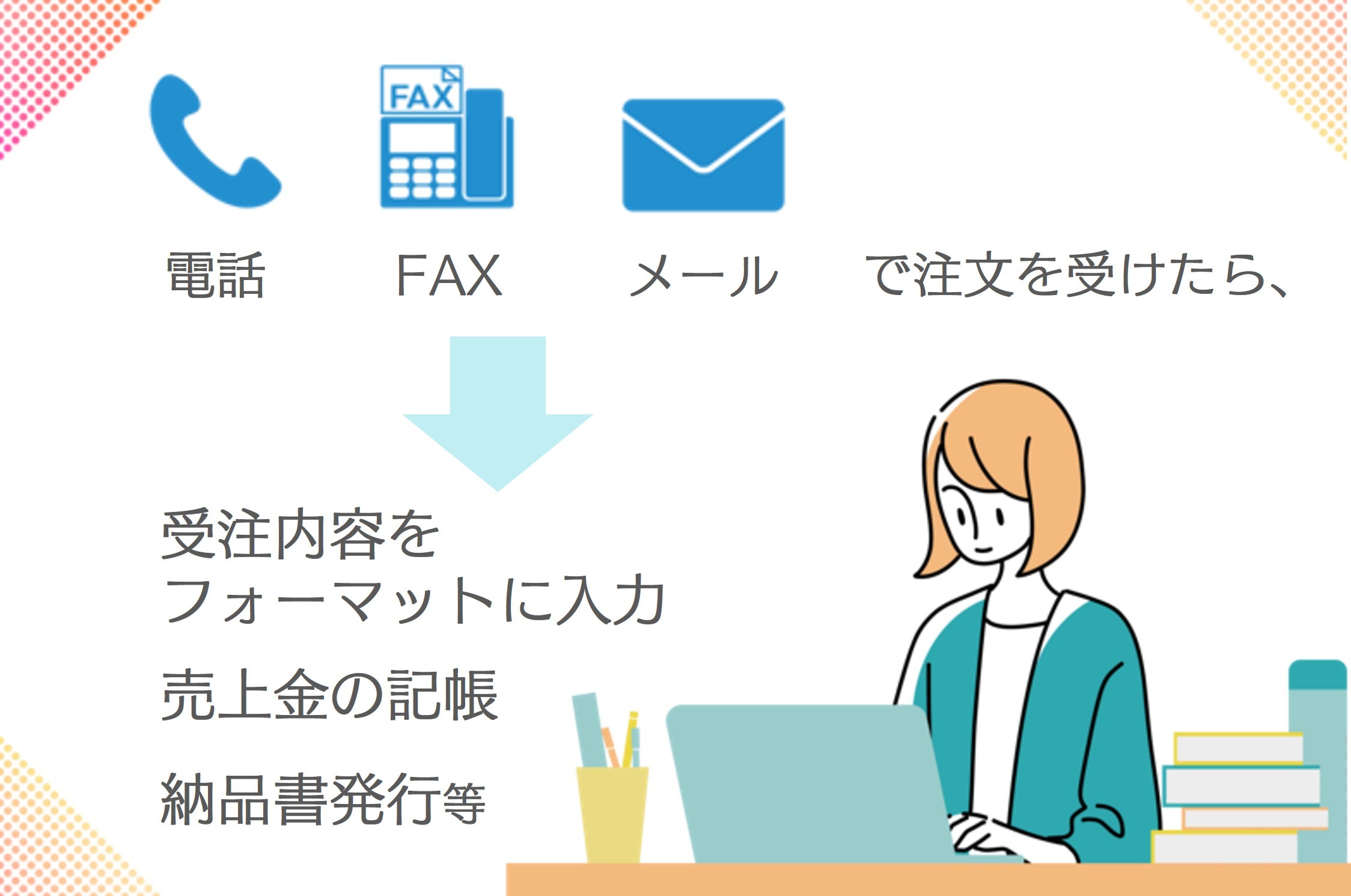 受注データをシステムへ登録し、注文請書や納品書などの書類を発行する。