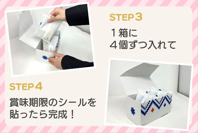 まずはスイーツを入れる専用のボックスを組み立てます。商品が個包装されているので、1つ1つに消費期限のシールを貼ります。
