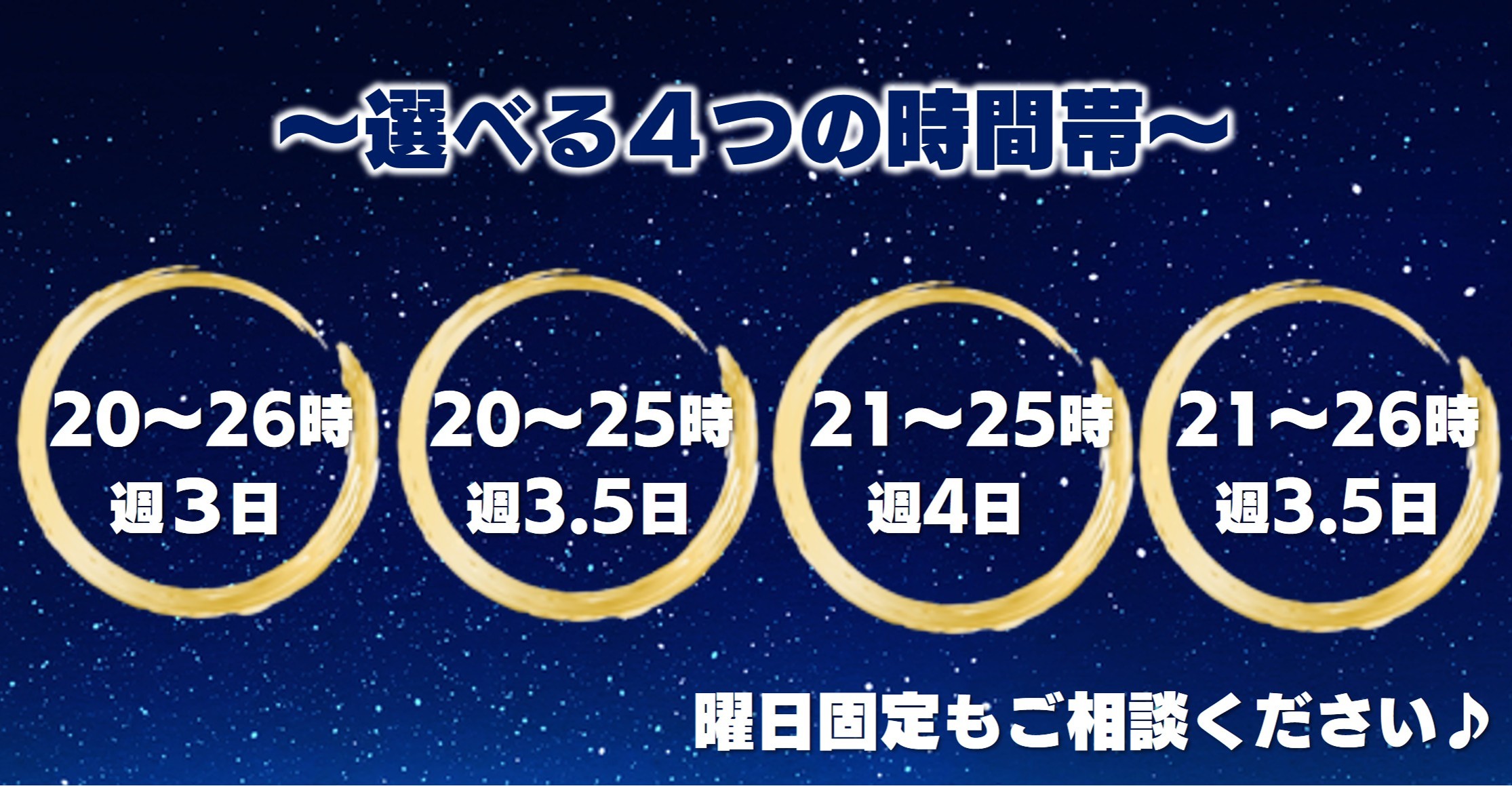 ▼ご希望の時間帯をお選びください。 (a)20:00~26:00/週3日 (b)20:00~25:00/週3.5日 (c)21:00~25:00/週4日 (d)21:00~26:00/週3.5日 ※曜日固定OK ※深夜帯(22時~翌5時)を含むため18歳以上の方を募集します