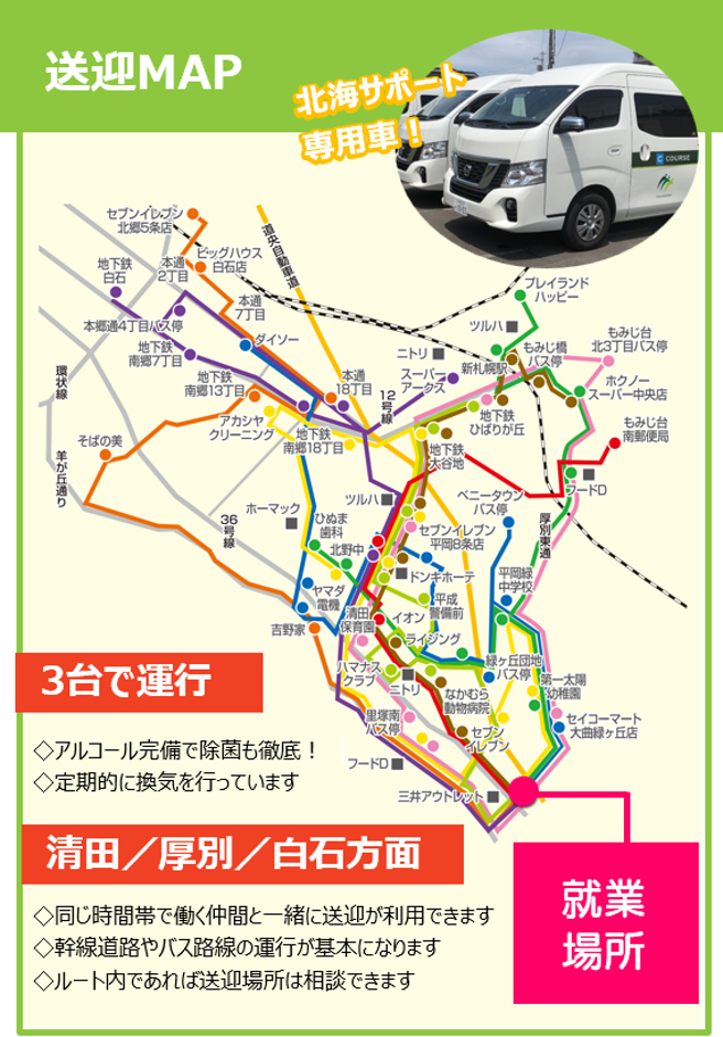 三井アウトレットパークから車で3分程度 ■札幌方面(白石区/厚別区/清田区)に送迎バス運行中■ 白石区・厚別区方面は上野幌や、地下鉄東西線「南郷18丁目駅」「新さっぽろ駅」「大谷地駅」から運行。 地下鉄までの交通費もしっかり支給します。 清田区方面・平岡・里塚などご乗車場所は幅広く相談可能です。 |