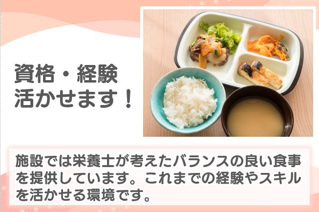 利用者様一人ひとりの栄養状態に配慮しながら、お食事を通じて健康を支えるやりがいのある環境。経験を活かし、即戦力としてご活躍いただけます。