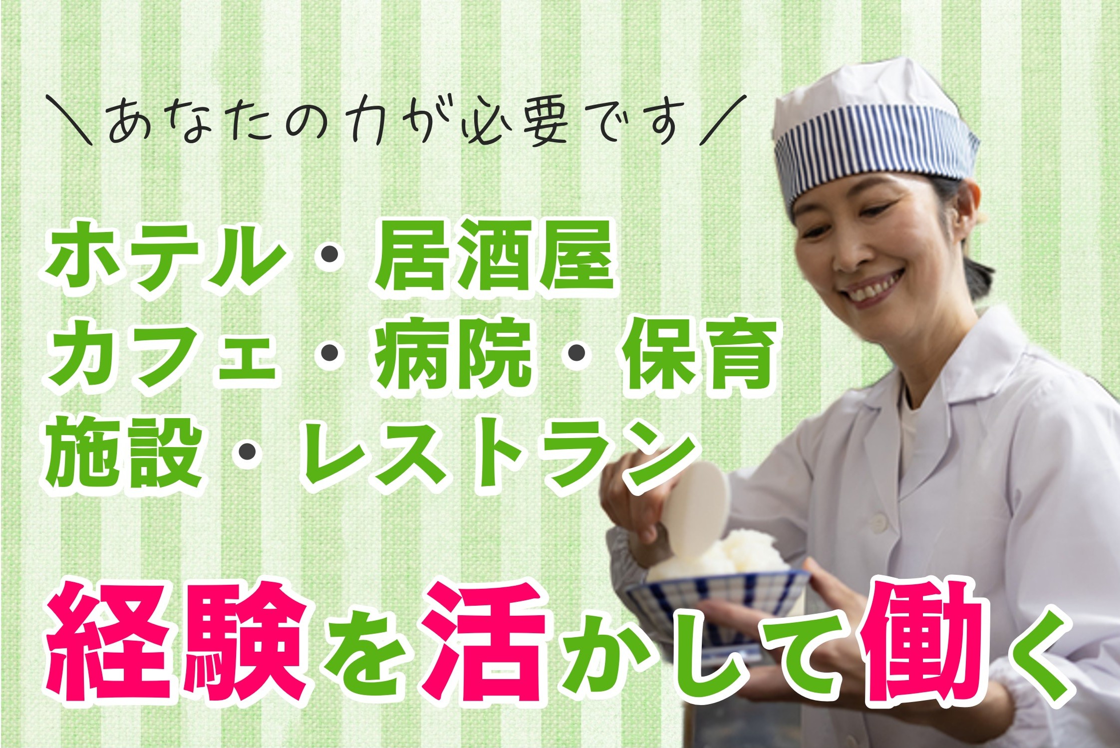 ホテル/居酒屋/カフェ/レストラン/保育・施設・病院での調理経験、いずれの経験も存分に活かして働くことができます。「十年前に数ヶ月だけ経験があるんだけど・・・」という方も大歓迎です♪