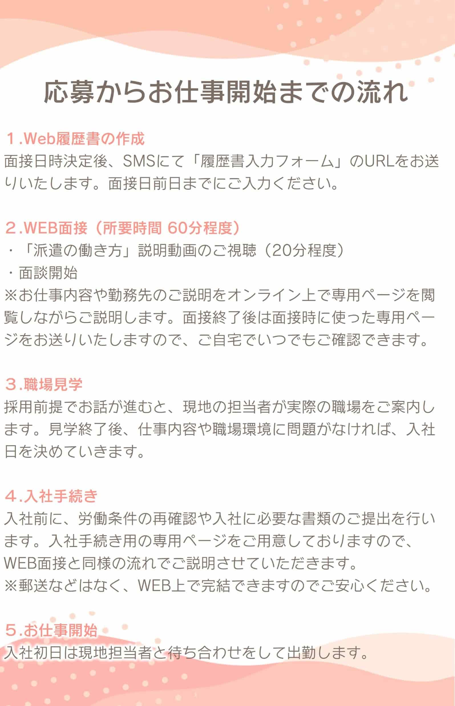 ▼WEB面接 または 来社面接 ▼選考(最短2日~1週間程度) ▼選考結果のご連絡 ▼就業開始 |