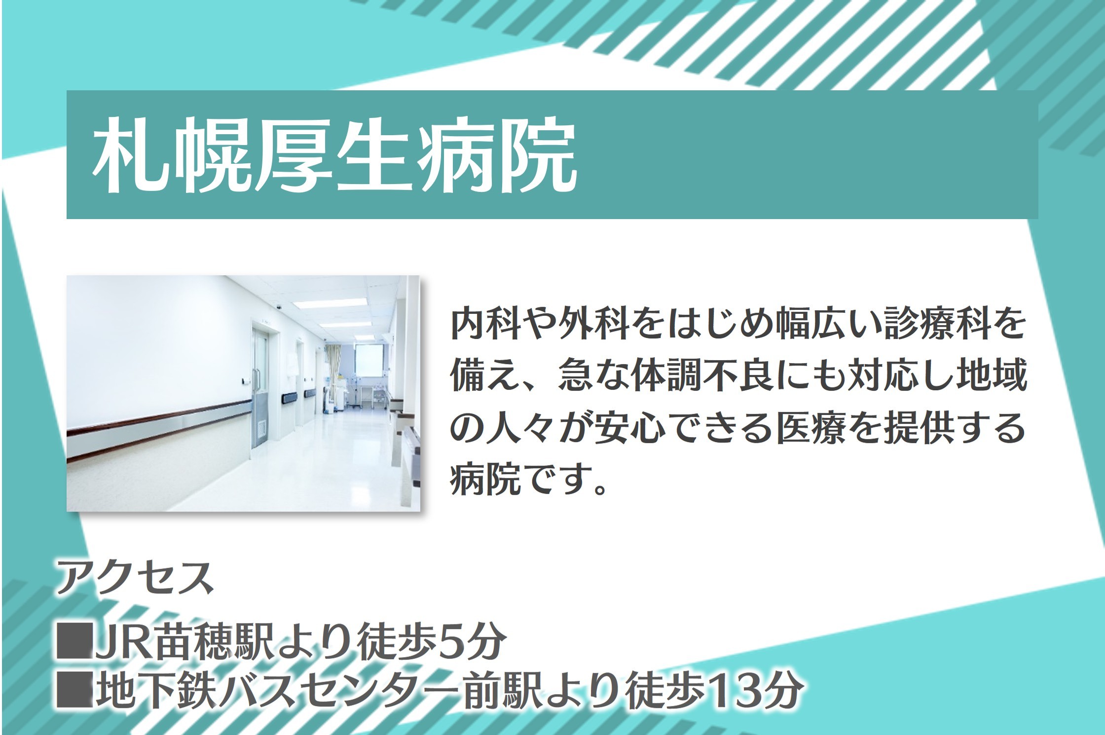 ■札幌厚生病院 JR「苗穂駅」から徒歩5分にある総合病院です。 急性期医療から外来・入院診療まで幅広く対応し、安心して受診できる環境を整えています。 |