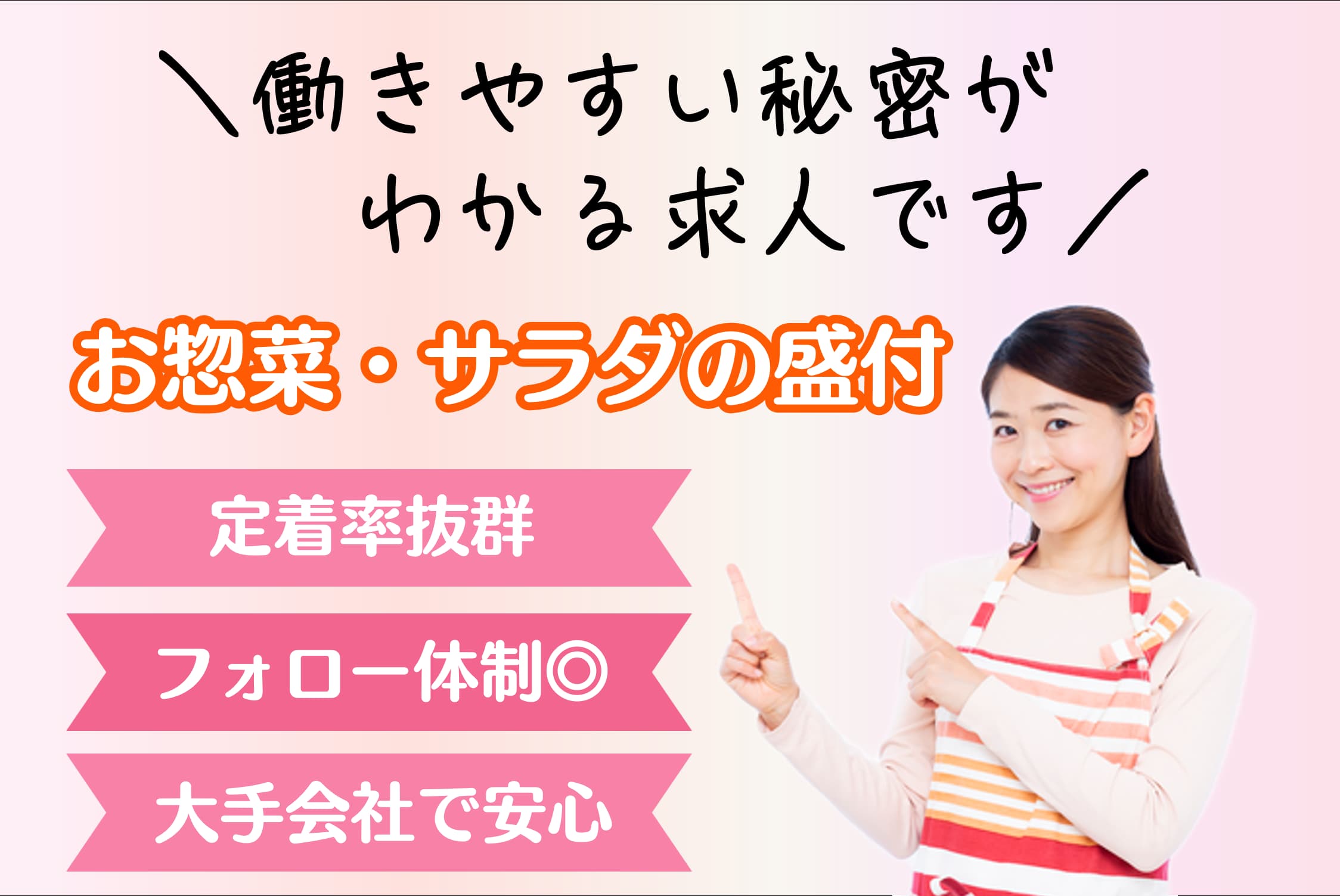 スーパーのお惣菜コーナーに並んでいる、パックサラダ/お惣菜の盛り付けをお願いします。 ☆決まった流れに合わせるのが得意な方にオススメ レーン作業なので、周りと一緒にテンポよく動くのが好きな方に◎ お電話でのお問い合わせの際は、求人番号000619をお伝えいただくとスムーズです。 |