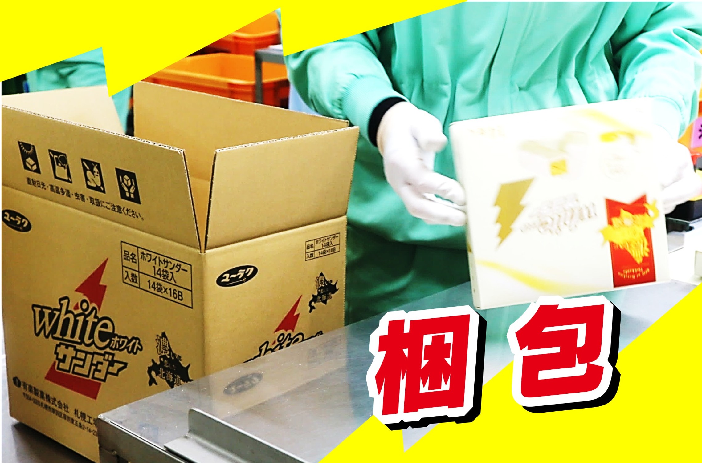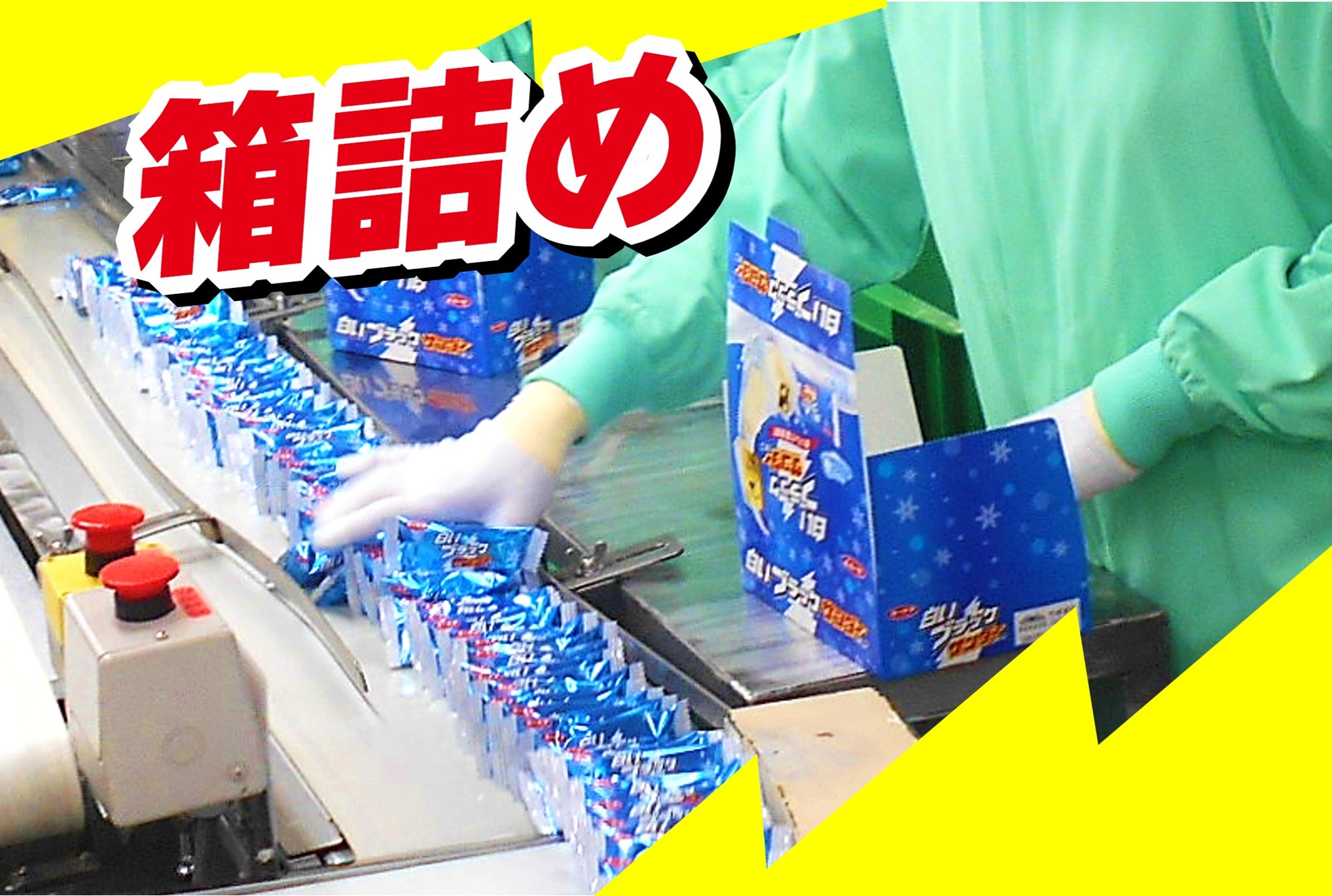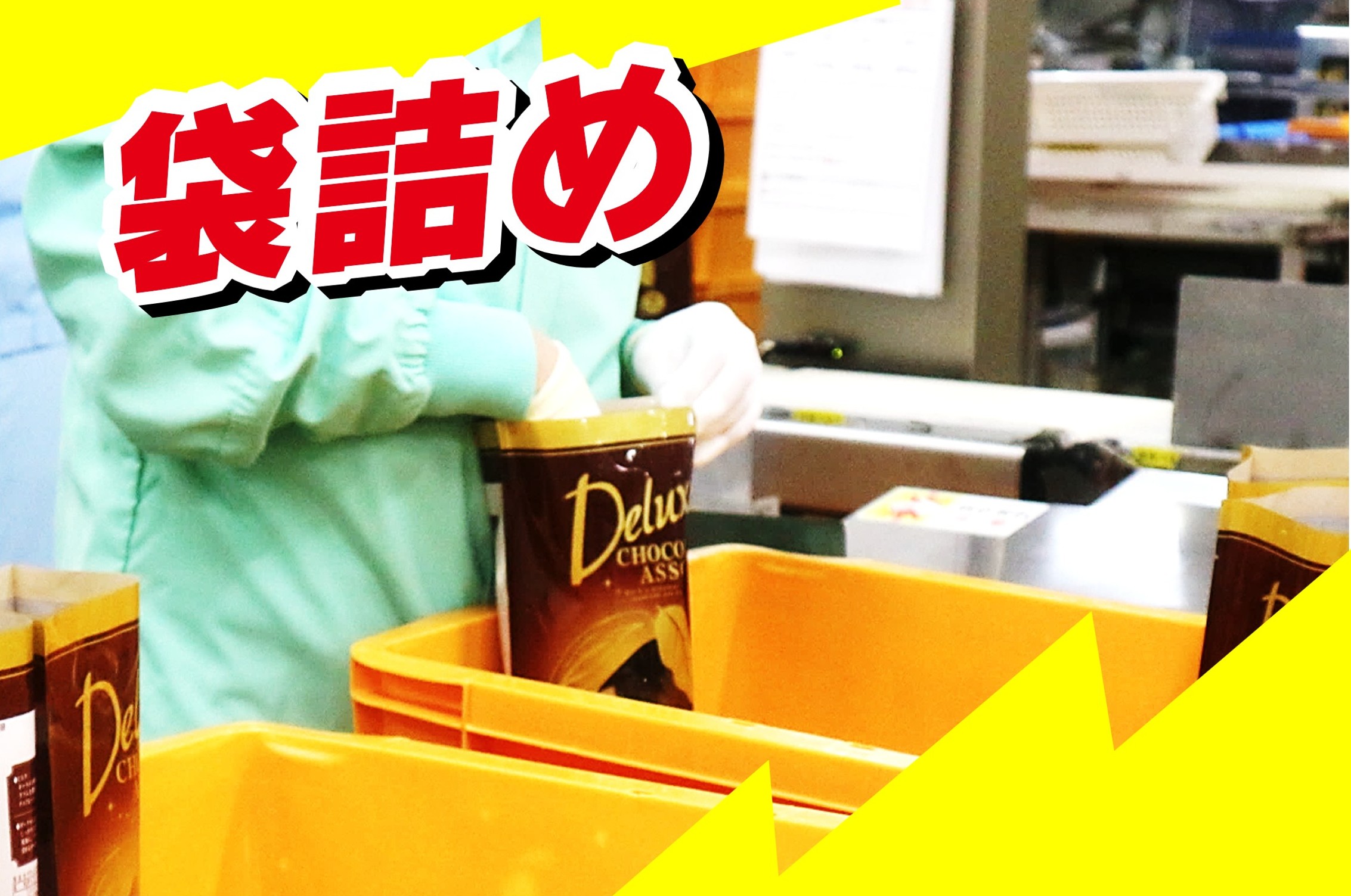 仕事内容 ブラックサンダーを製造している工場で、個包装になった商品を箱詰めや袋詰め、シール貼り等をお願いします。