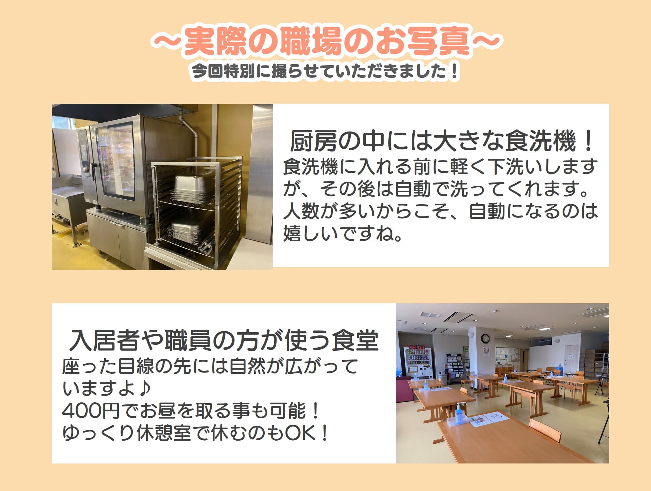 朝昼晩のご飯を提供しているので、皆さん早番遅番を交代制で働いています。