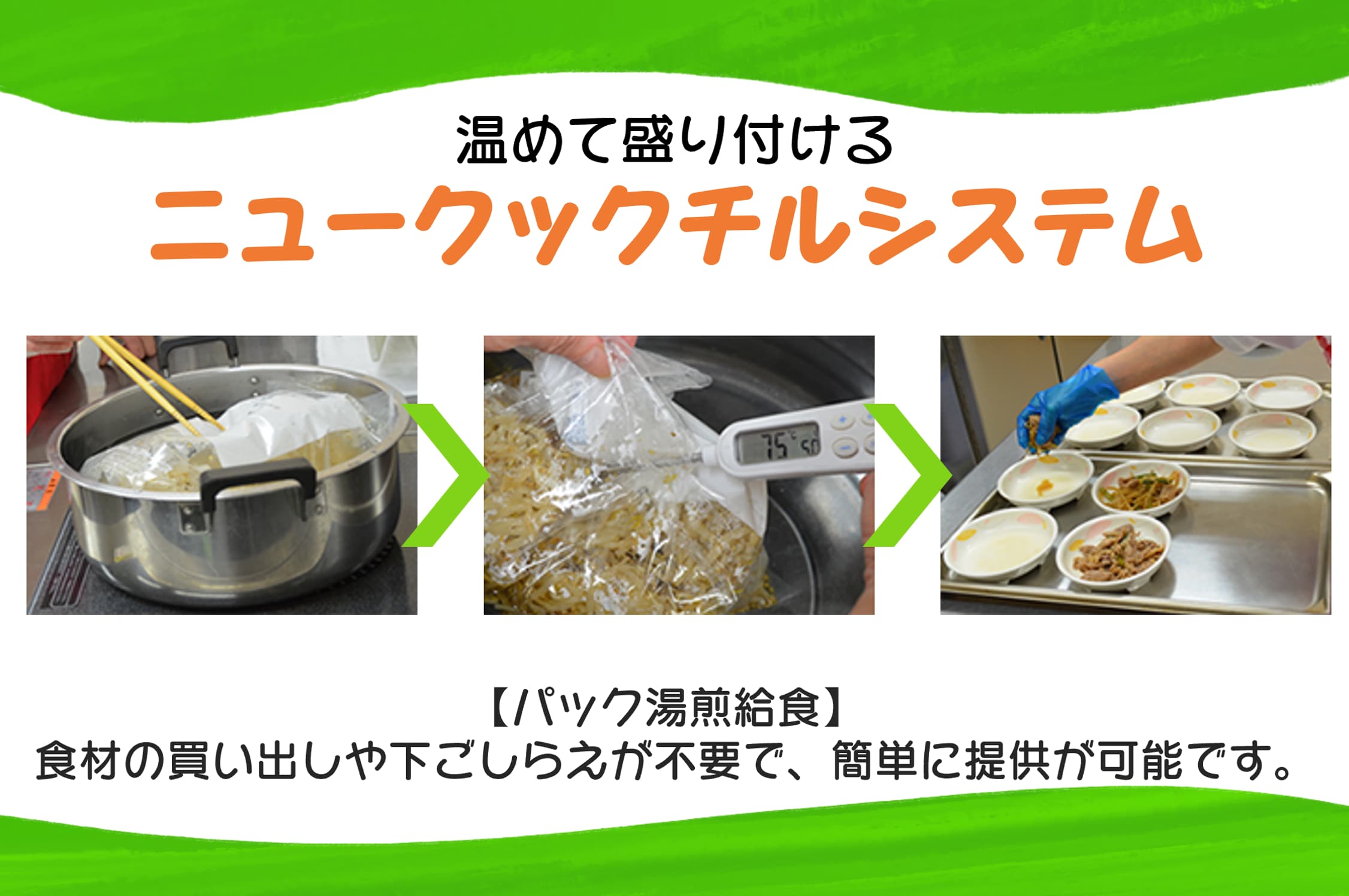 大量調理でも衛生的で安全に保存・供給できるため、病院・学校・社員食堂などで多く利用されています。