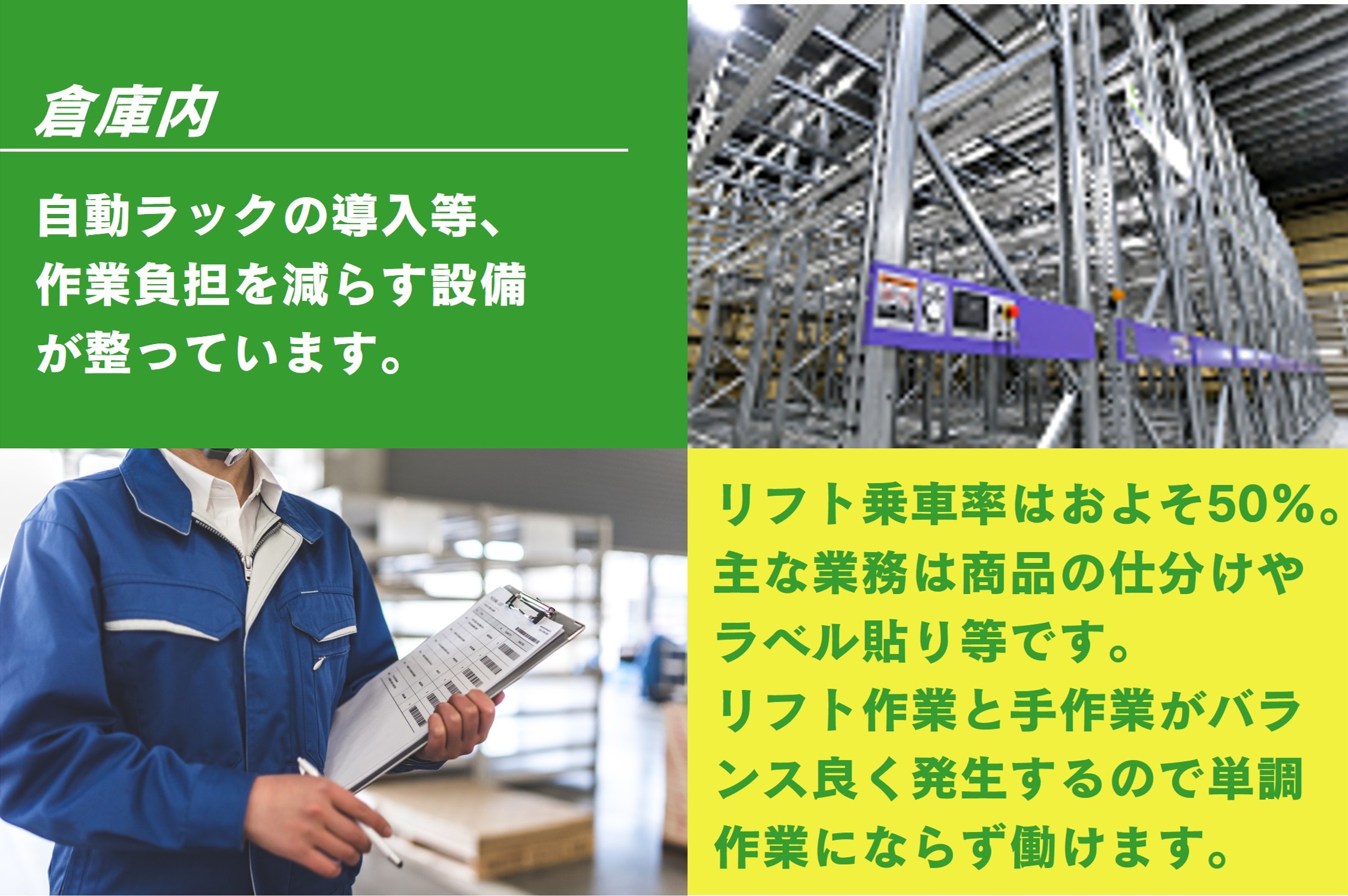リフト乗車率は50%!リフト作業と手作業の仕分け作業がございます。