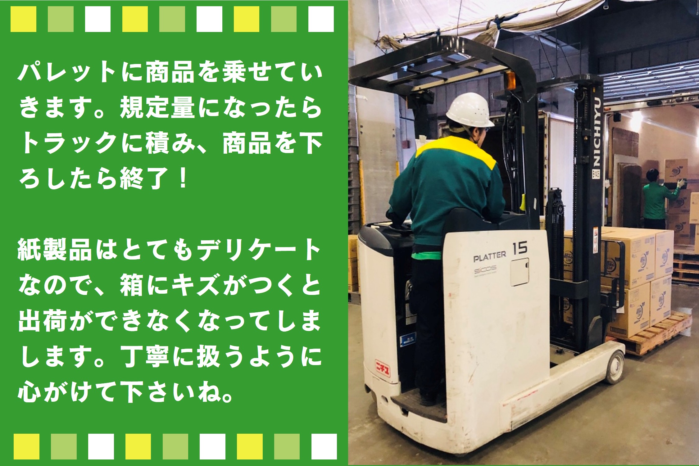 倉庫内で紙製品や日用品の入出庫作業をお願いします。
