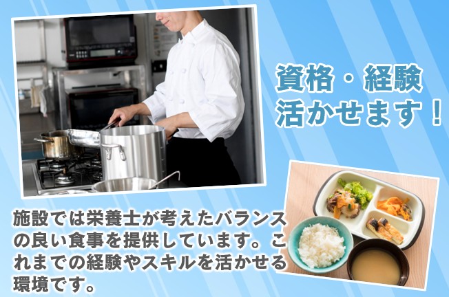 利用者様一人ひとりの栄養状態に配慮しながら、お食事を通じて健康を支えるやりがいのある環境。経験を活かし、即戦力としてご活躍いただけます。