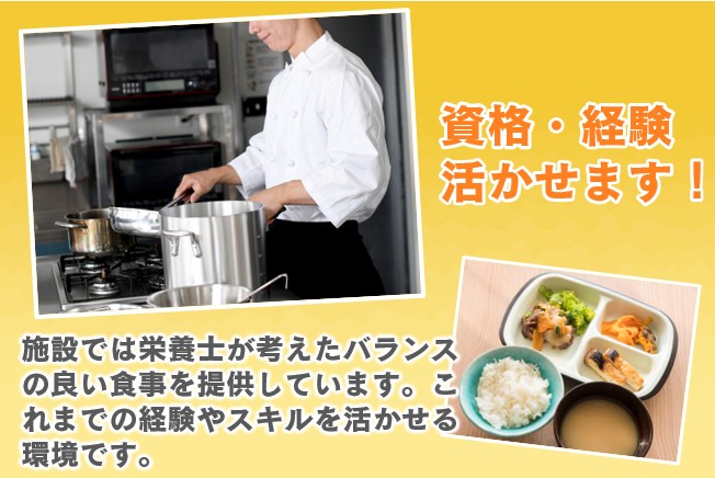 利用者様一人ひとりの栄養状態に配慮しながら、お食事を通じて健康を支えるやりがいのある環境。経験を活かし、即戦力としてご活躍いただけます。
