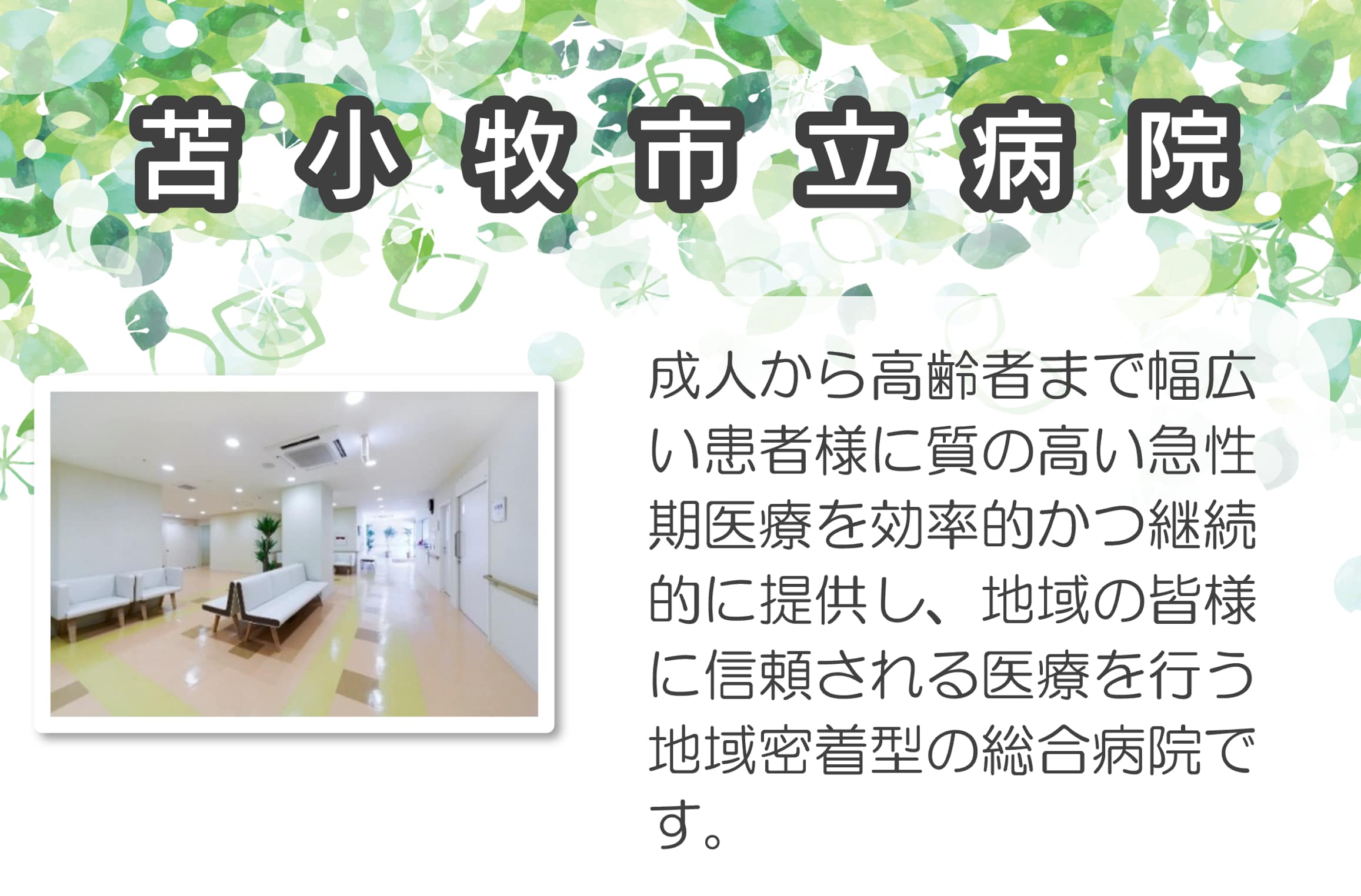 ■苫小牧市立病院 患者さんが住み慣れた自宅や地域での生活を重視する地域完結型の医療を行っていくことを目指しており、成人・高齢者までの質の高い急性期医療を効率的にそして継続的に展開。 地域の医療に貢献し、地域の皆様に信頼される医療を行う、地域に根差した総合病院です。 |