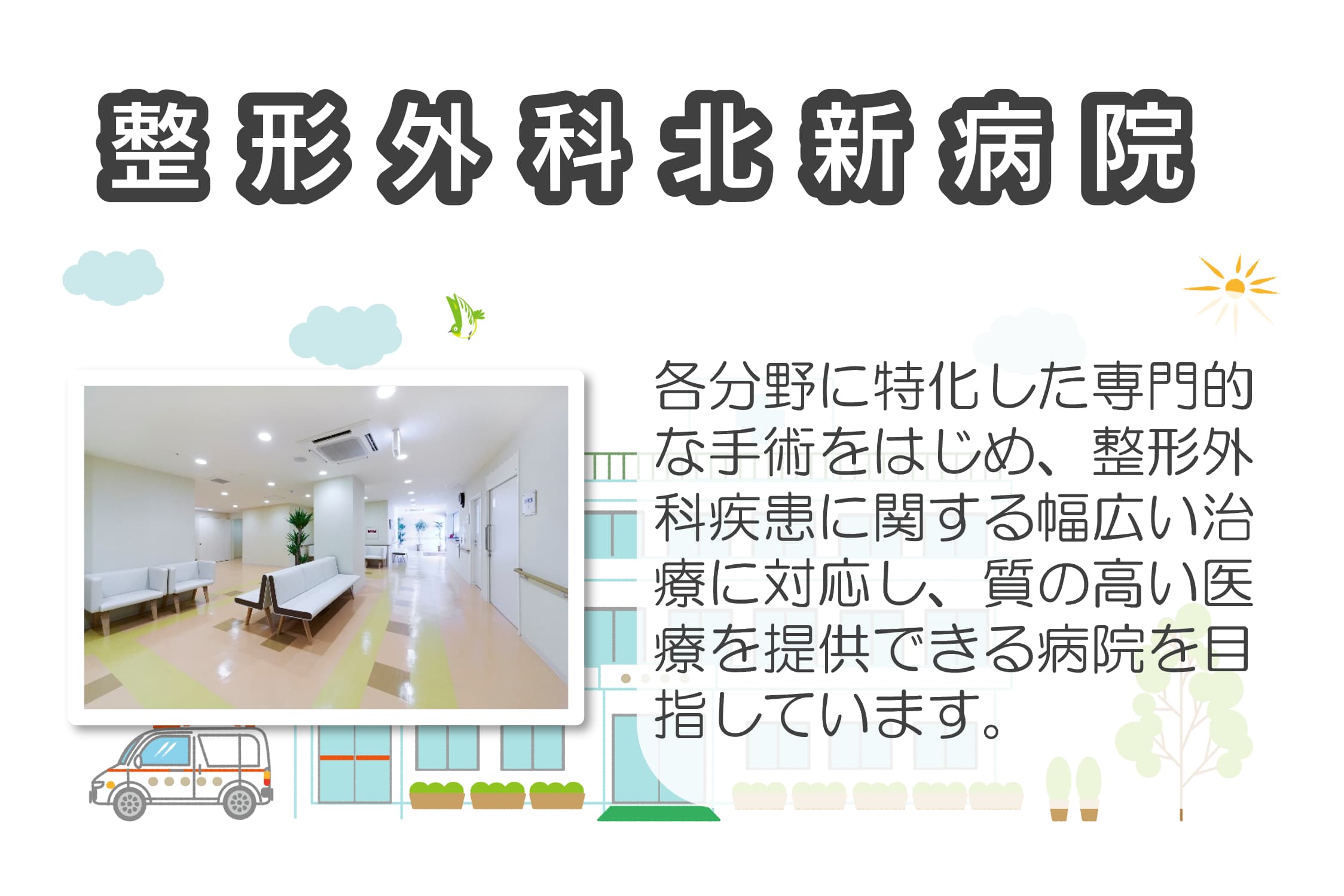 2020年8月に開院した整形外科です。 各分野に特化した専門的な手術をはじめ、整形外科疾患に関する幅広い治療に対応し、質の高い医療を提供できる病院を目指しています。 |