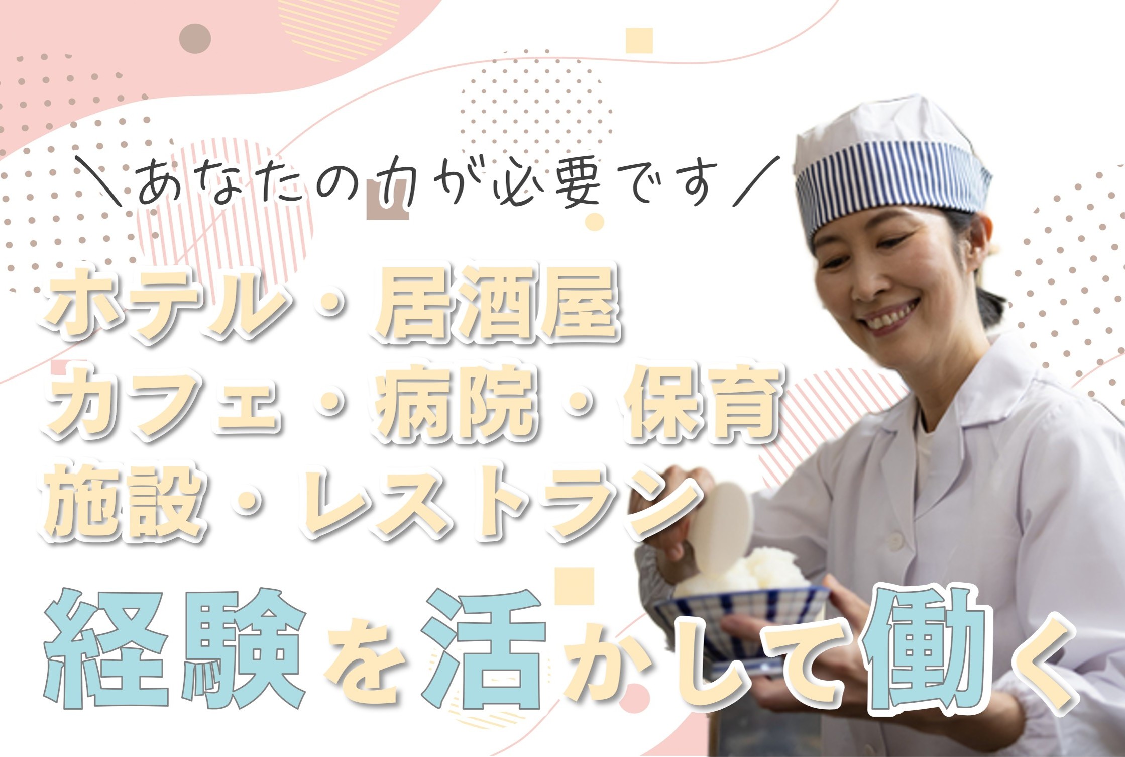 ホテル/居酒屋/カフェ/レストラン/保育・施設・病院での調理経験、いずれの経験も存分に活かして働くことができます。「十年前に数ヶ月だけ経験があるんだけど・・・」という方も大歓迎です♪