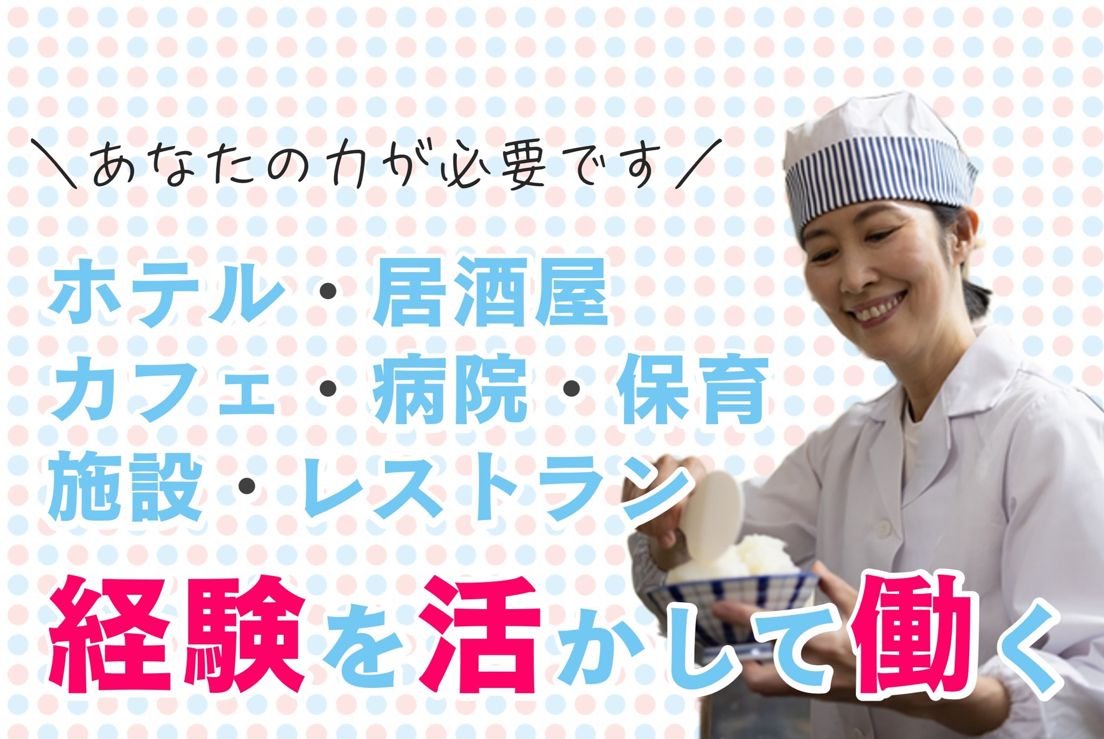 ホテル/居酒屋/カフェ/レストラン/保育・施設・病院での調理経験、いずれの経験も存分に活かして働くことができます。「十年前に数ヶ月だけ経験があるんだけど・・・」という方も大歓迎です♪
